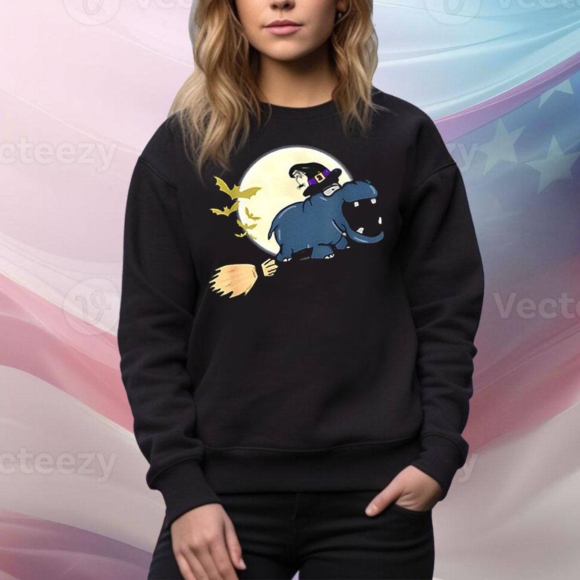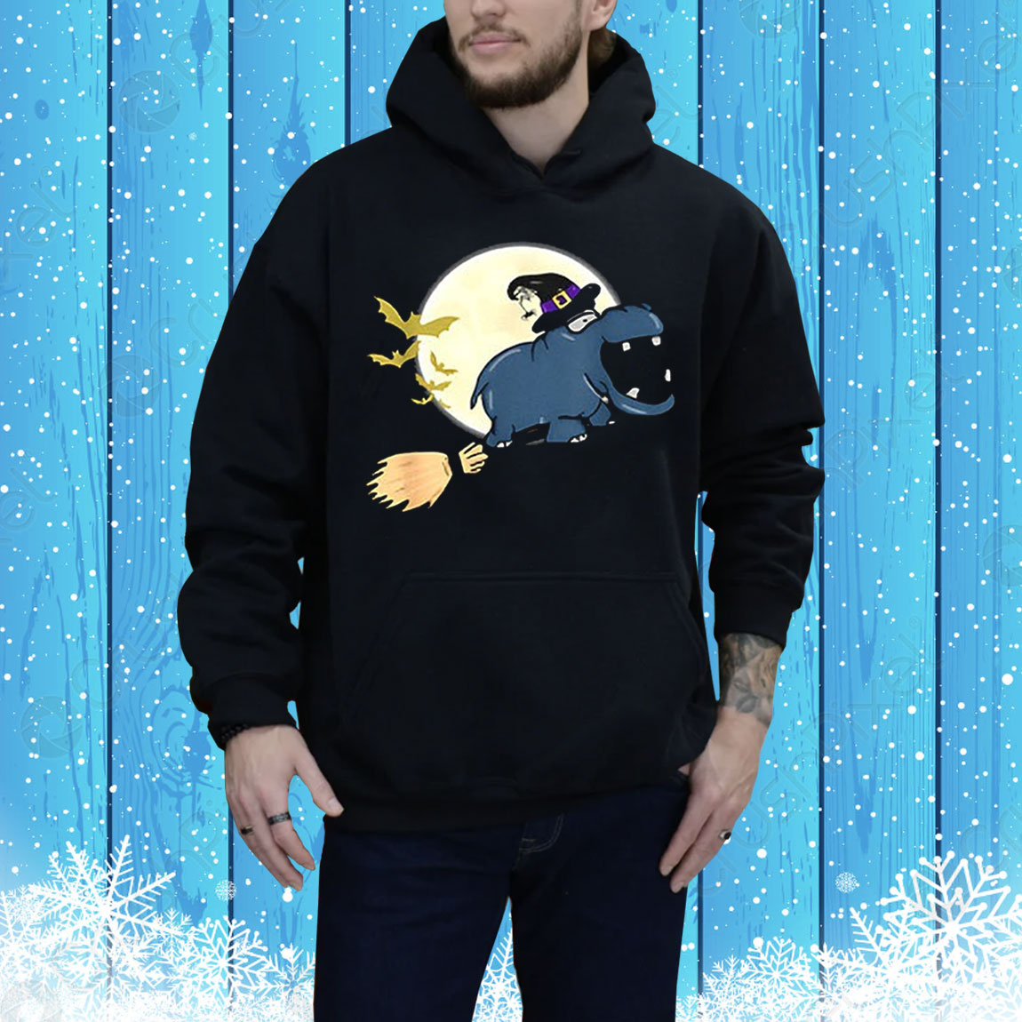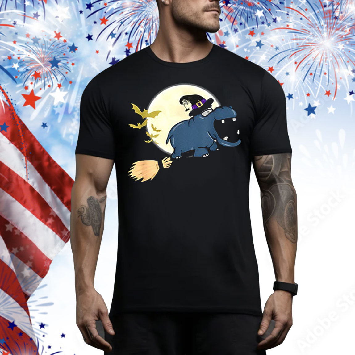 Hippo witch hat riding broom stick zoo animal Halloween Tee Shirt